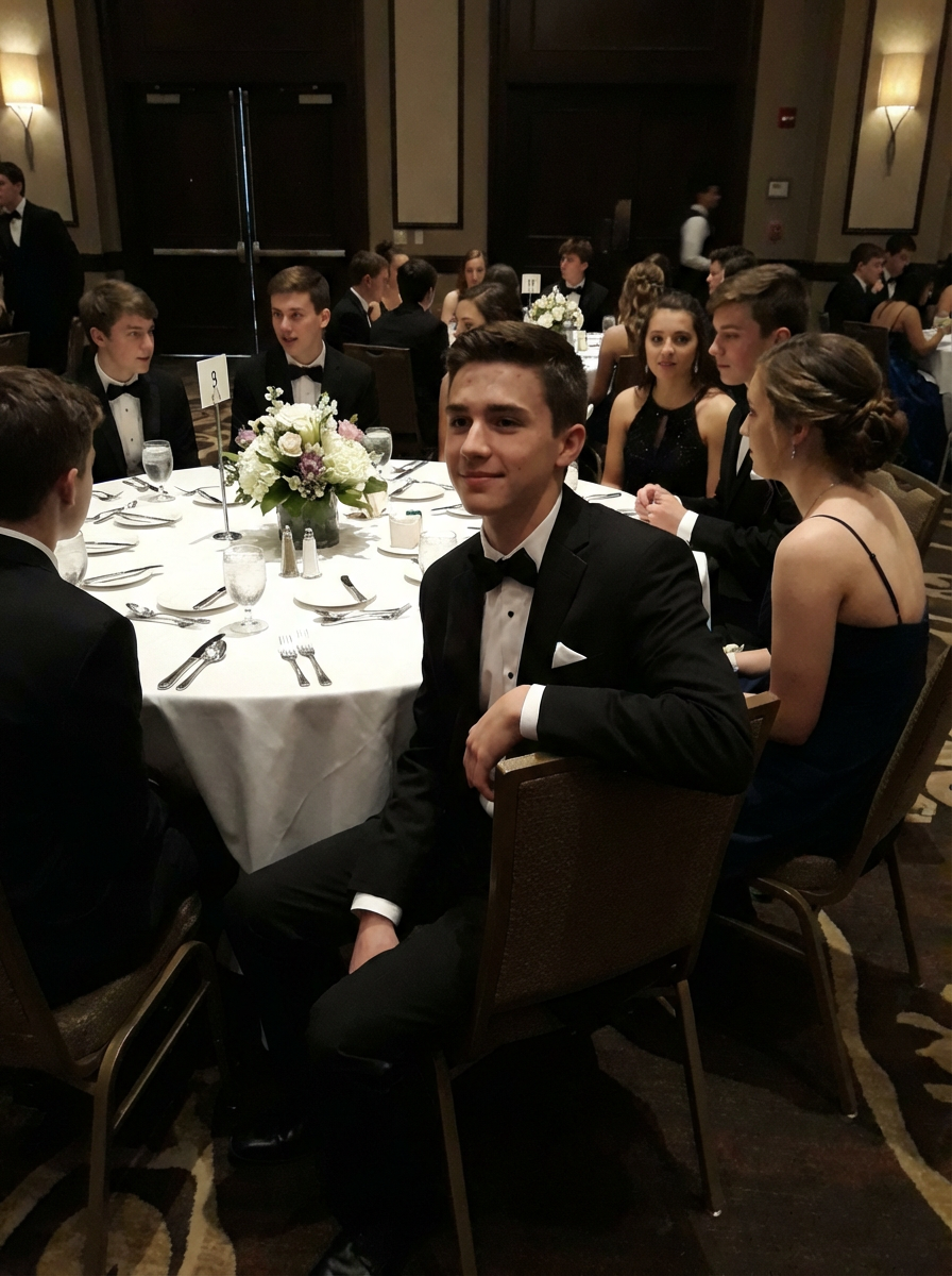 model at prom dinner table, elegant venue setting, formal attire, sophisticated teenage moment