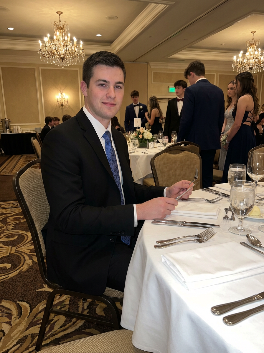 model at prom dinner table, elegant venue setting, formal attire, sophisticated teenage moment
