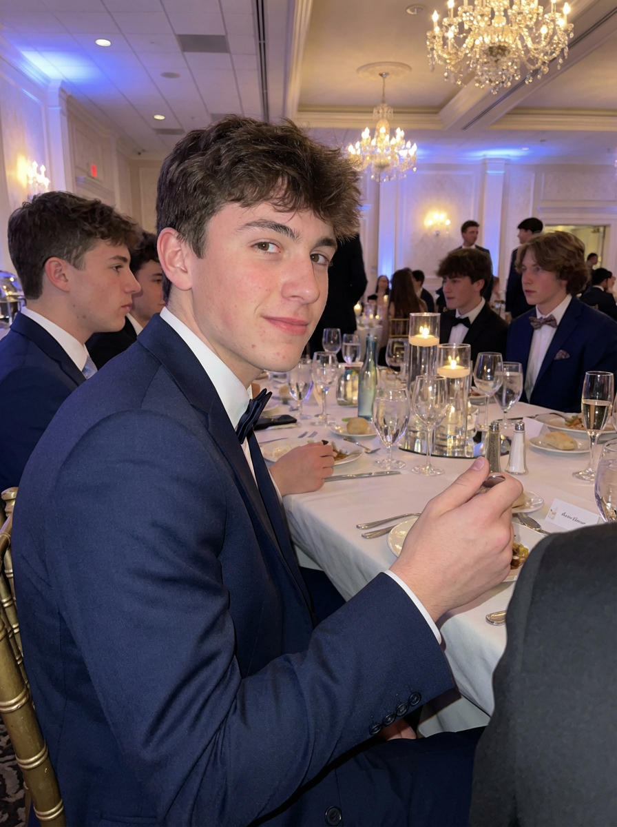 model at prom dinner table, elegant venue setting, formal attire, sophisticated teenage moment