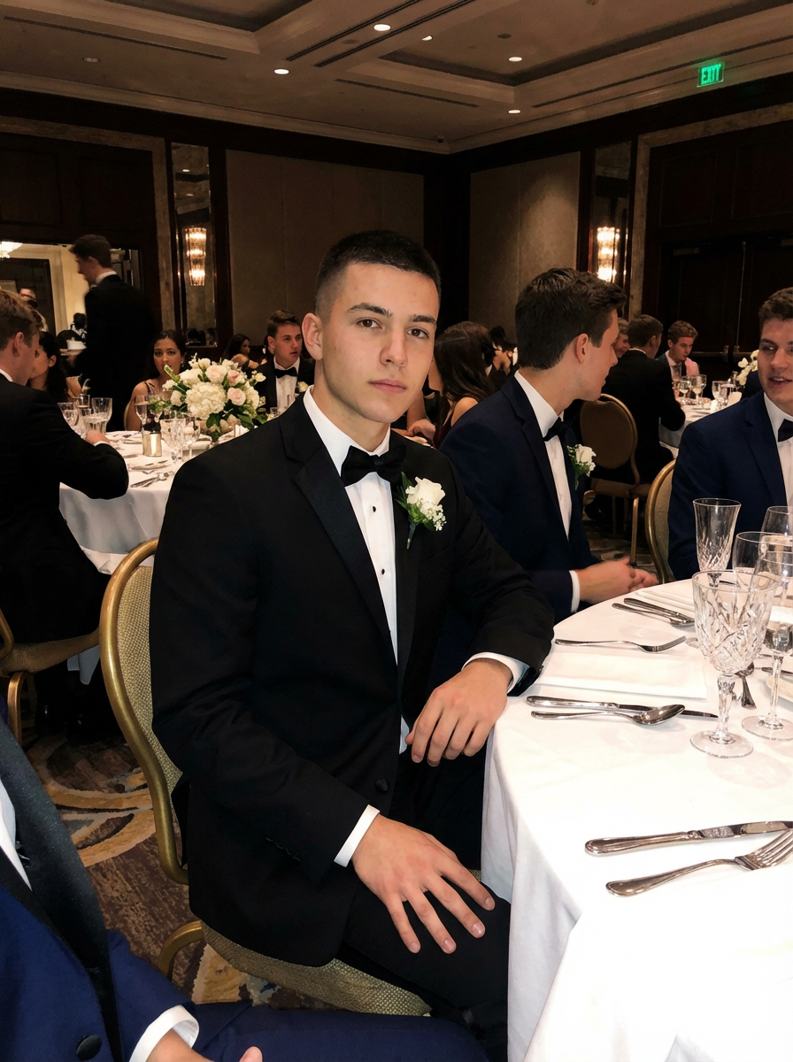 model at prom dinner table, elegant venue setting, formal attire, sophisticated teenage moment