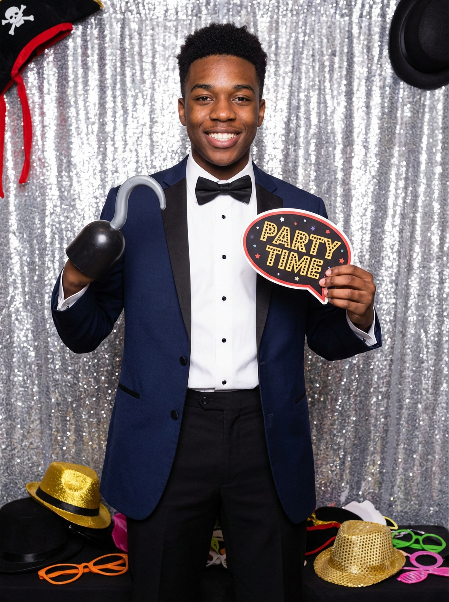 model at prom photo booth, fun props, dapper formal style, playful poses