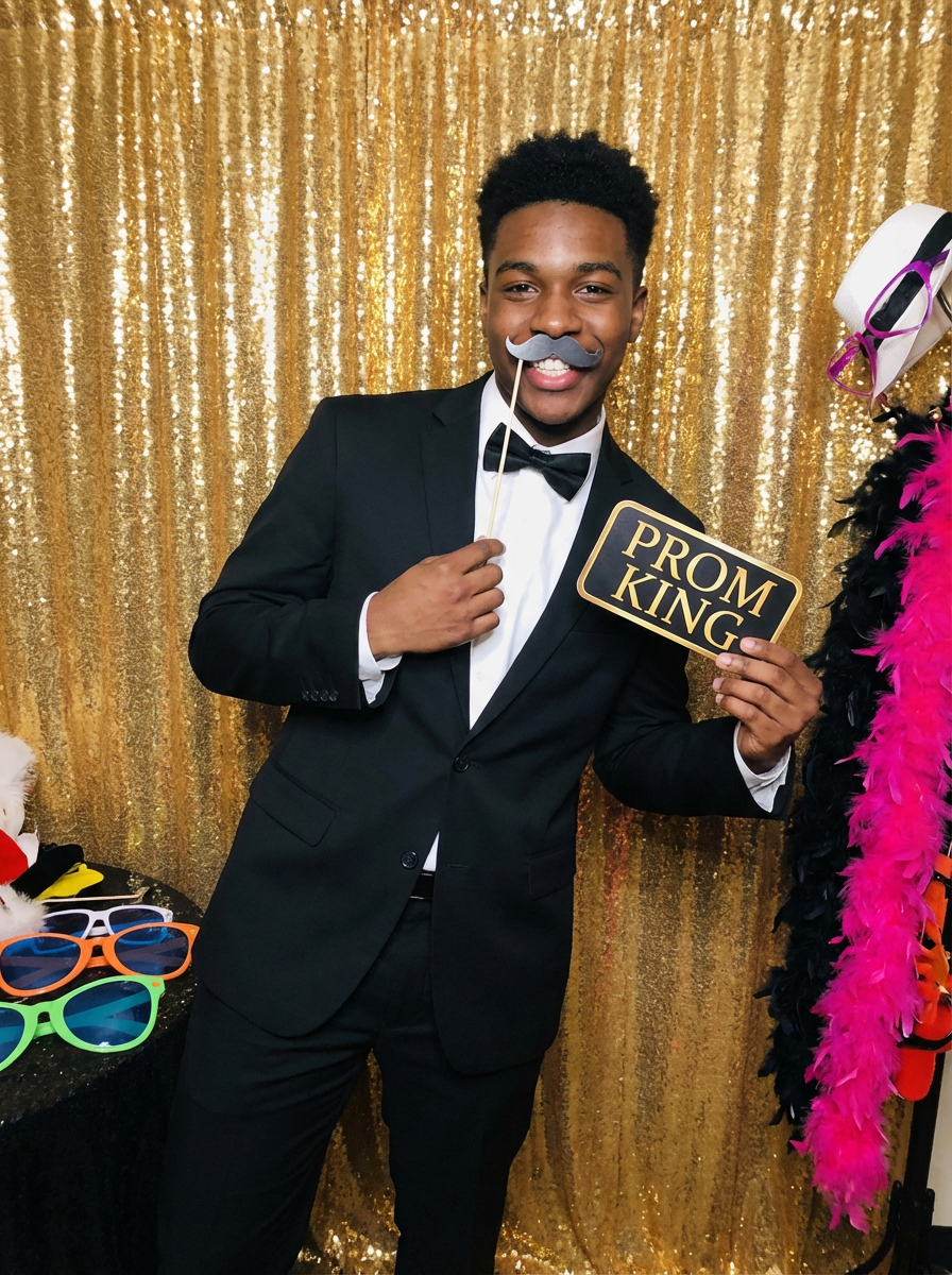 model at prom photo booth, fun props, dapper formal style, playful poses