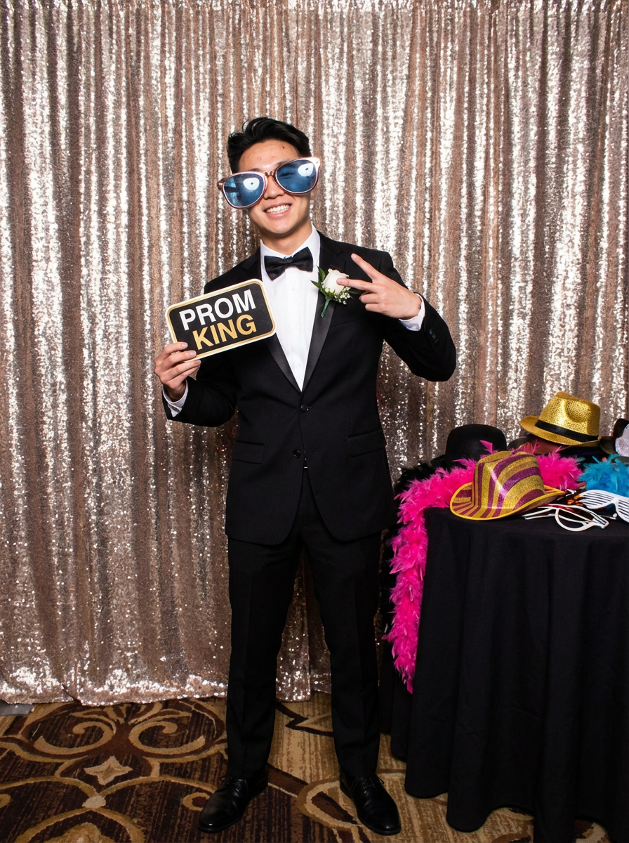 model at prom photo booth, fun props, dapper formal style, playful poses