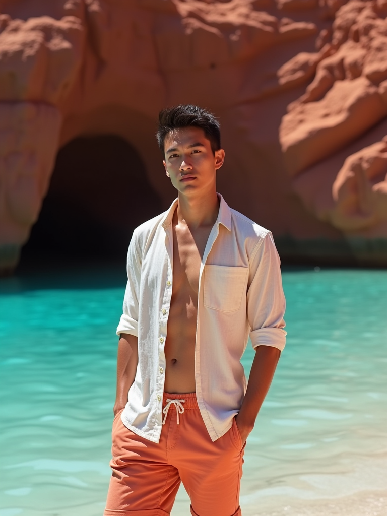 model at Red Beach, wearing beach shorts with a light cotton shirt, dramatic red cliffs and crystal clear waters