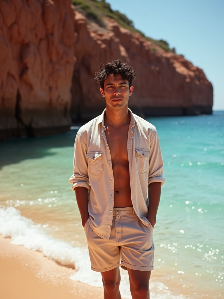 model at Red Beach, wearing beach shorts with a light cotton shirt, dramatic red cliffs and crystal clear waters