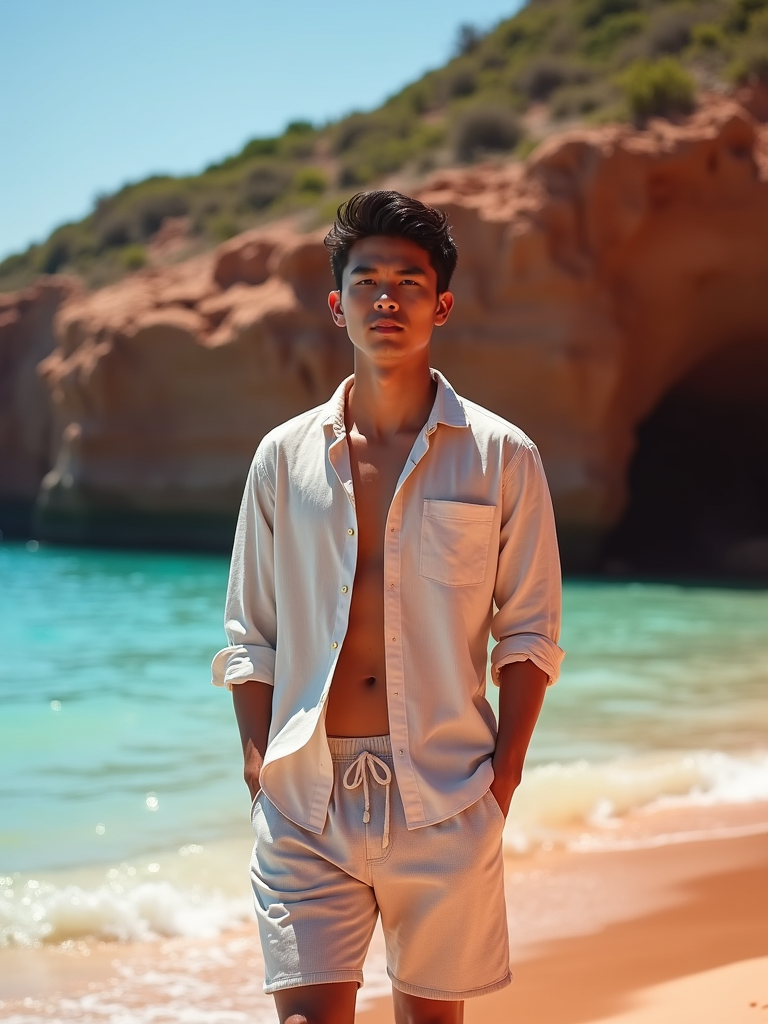 model at Red Beach, wearing beach shorts with a light cotton shirt, dramatic red cliffs and crystal clear waters