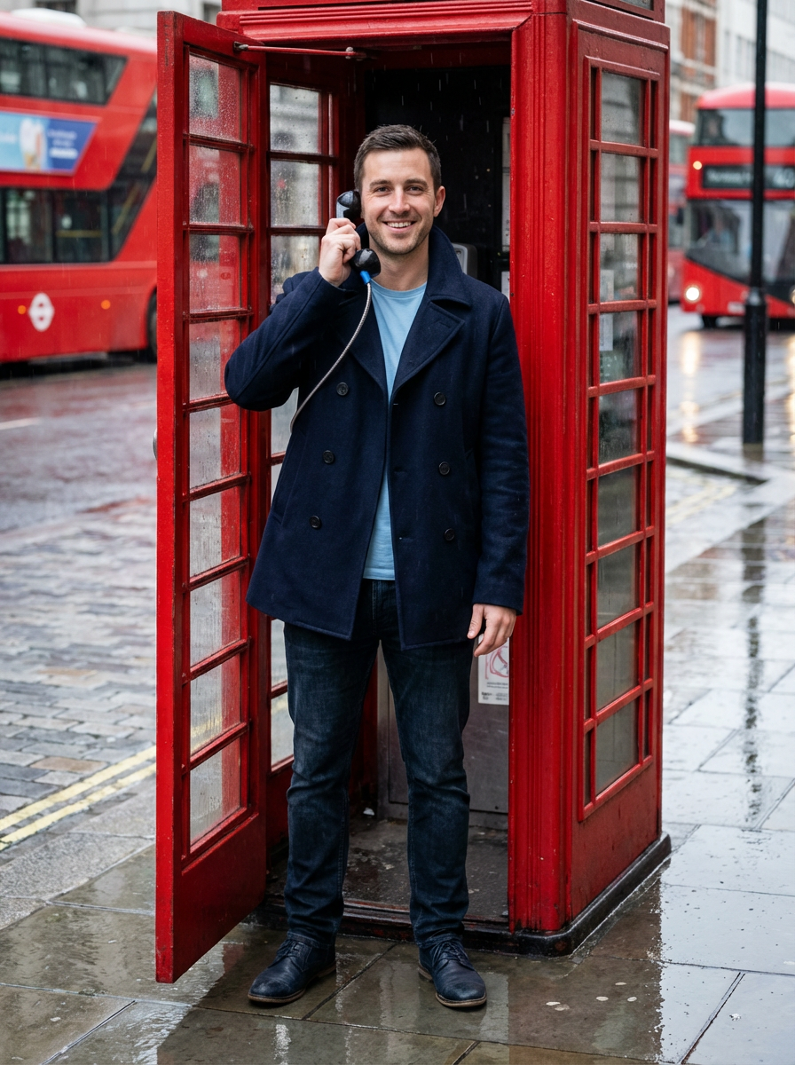 model at red telephone box, classic London icon, peacoat, rainy day aesthetic