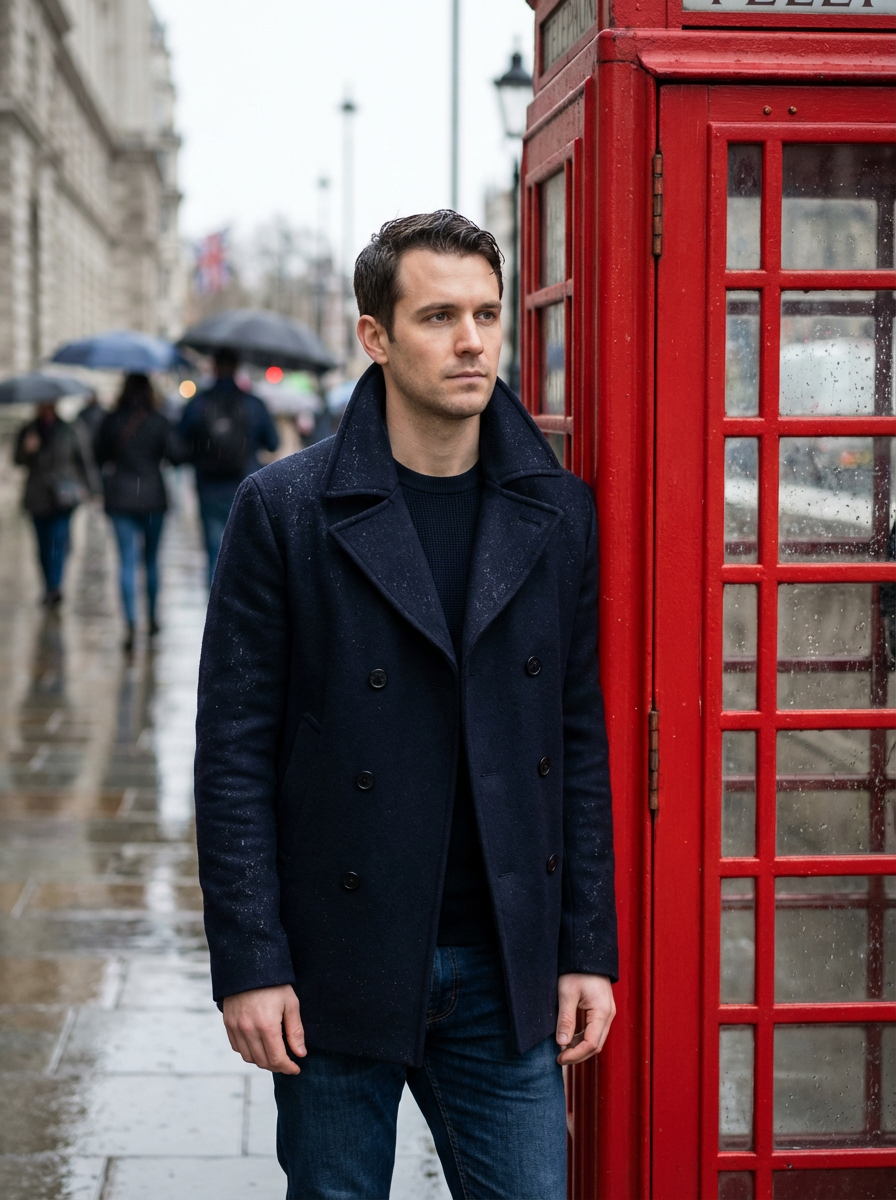 model at red telephone box, classic London icon, peacoat, rainy day aesthetic