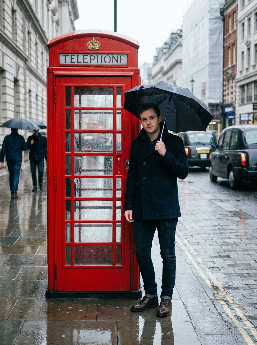 model at red telephone box, classic London icon, peacoat, rainy day aesthetic
