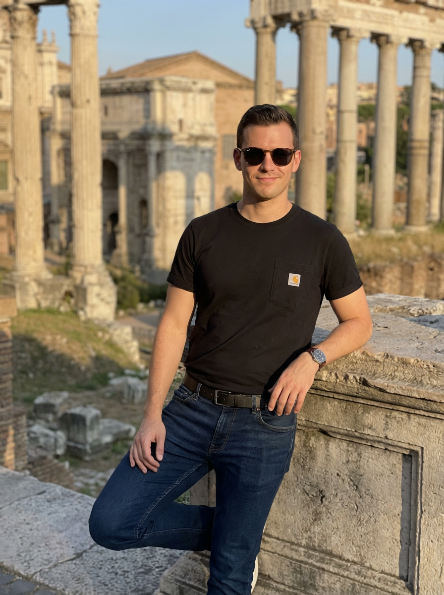 model at Roman Forum ruins, ancient history backdrop, stylish tourist outfit, warm lighting