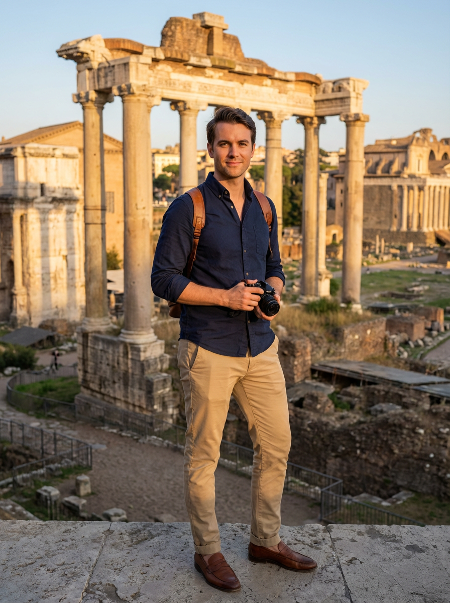 model at Roman Forum ruins, ancient history backdrop, stylish tourist outfit, warm lighting
