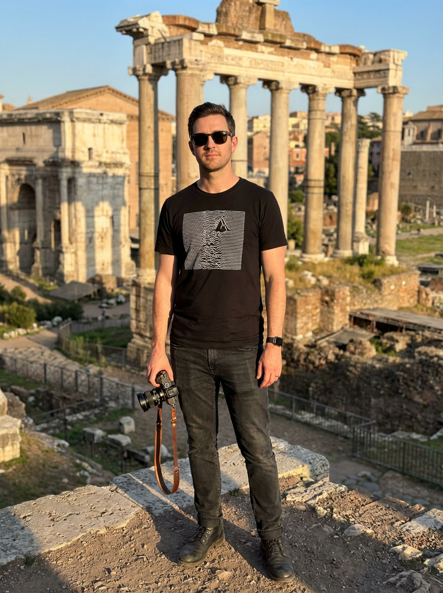 model at Roman Forum ruins, ancient history backdrop, stylish tourist outfit, warm lighting
