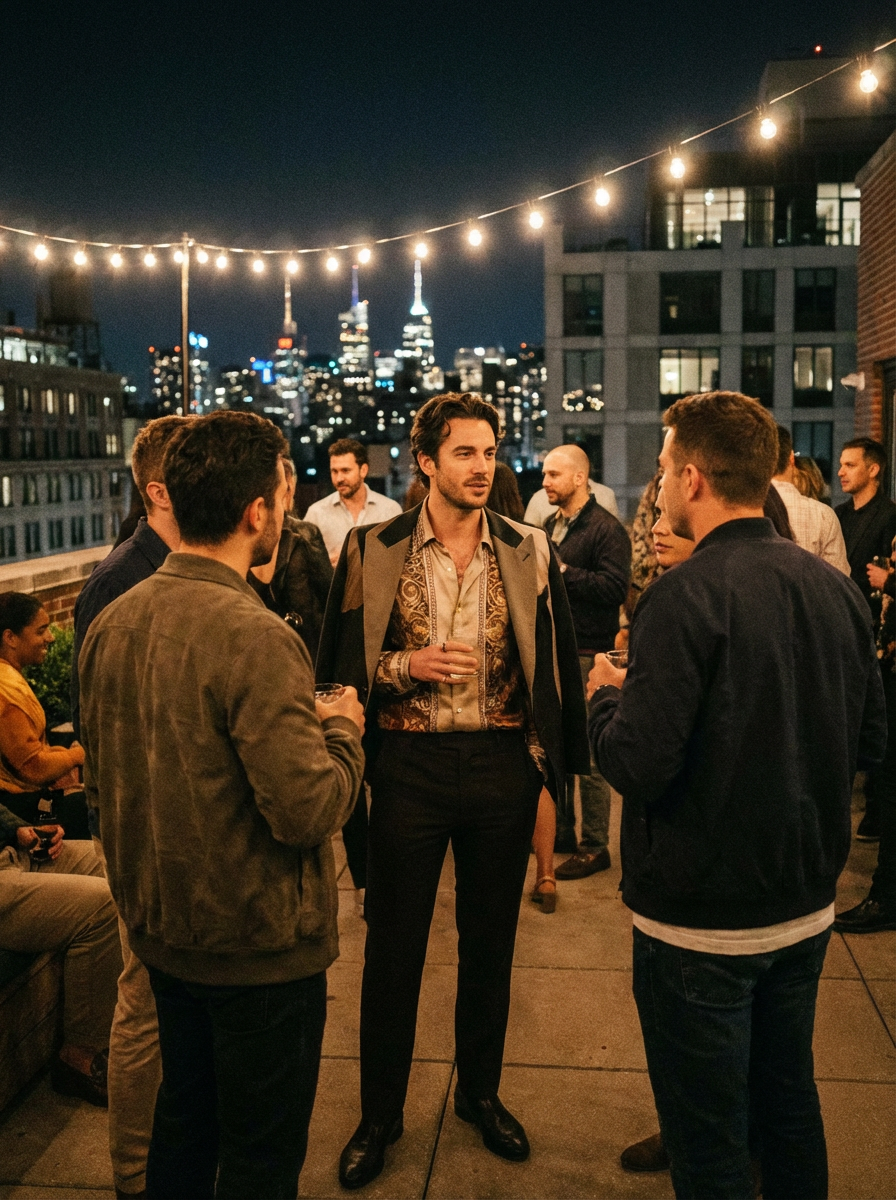 model at rooftop party, social creative scene, fashionable unique outfit, city night lights