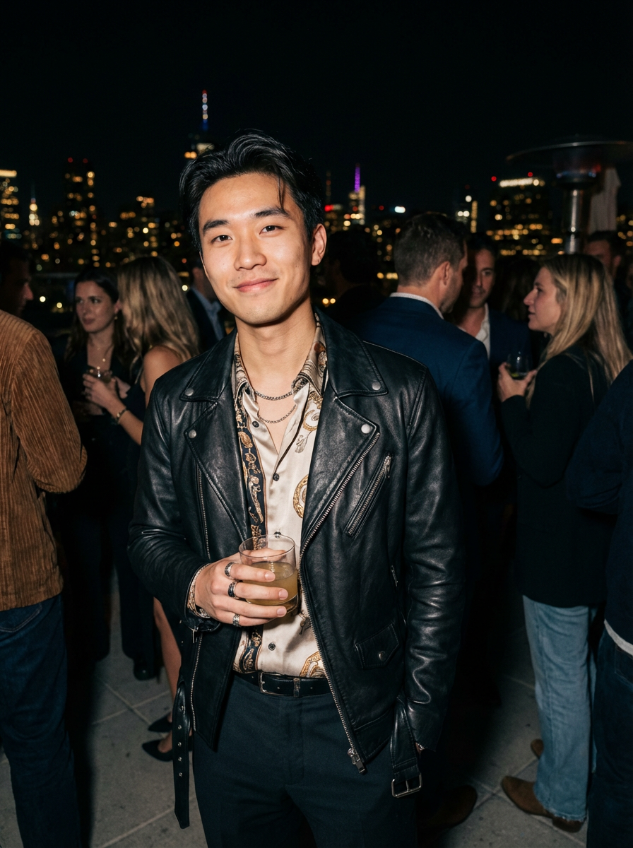 model at rooftop party, social creative scene, fashionable unique outfit, city night lights
