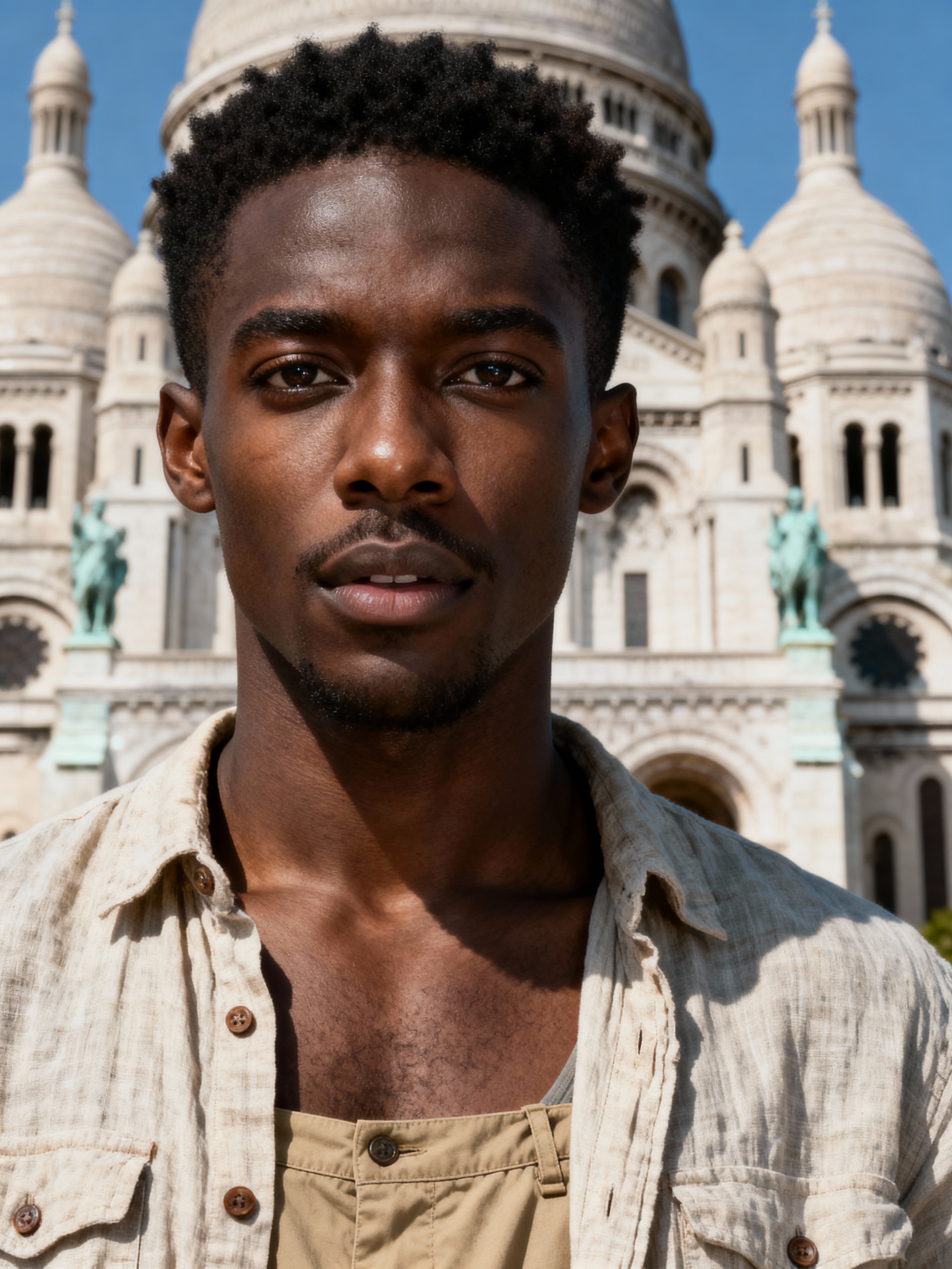 model at Sacré-Cœur Basilica, wearing khaki shorts with a linen button-up, traditional architecture visible