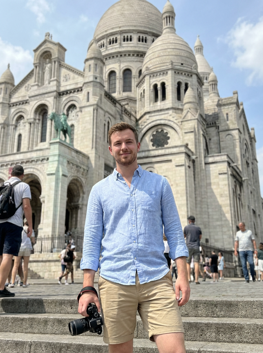 model at Sacré-Cœur Basilica, wearing khaki shorts with a linen button-up, traditional architecture visible