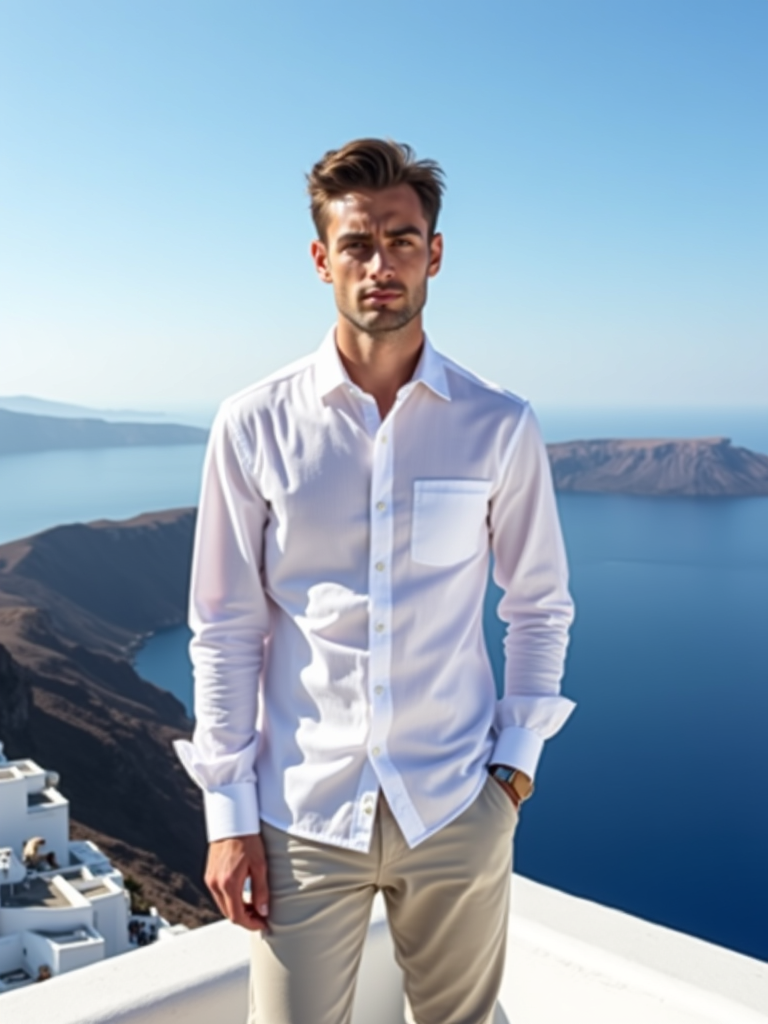 model at Santorini caldera viewpoint, wearing a crisp white shirt with light pants, panoramic volcanic views and clear blue skies