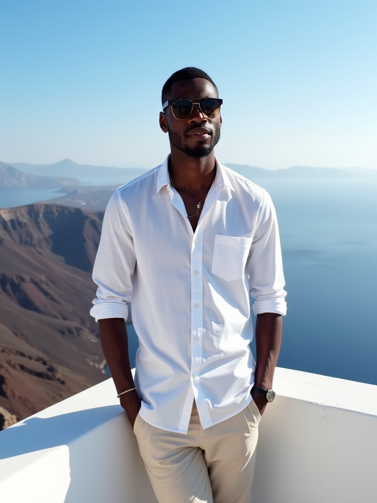 model at Santorini caldera viewpoint, wearing a crisp white shirt with light pants, panoramic volcanic views and clear blue skies