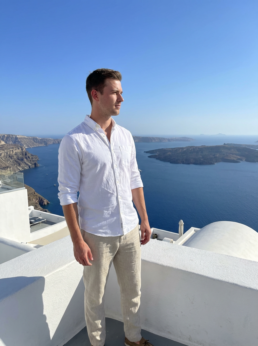 model at Santorini caldera viewpoint, wearing a crisp white shirt with light pants, panoramic volcanic views and clear blue skies