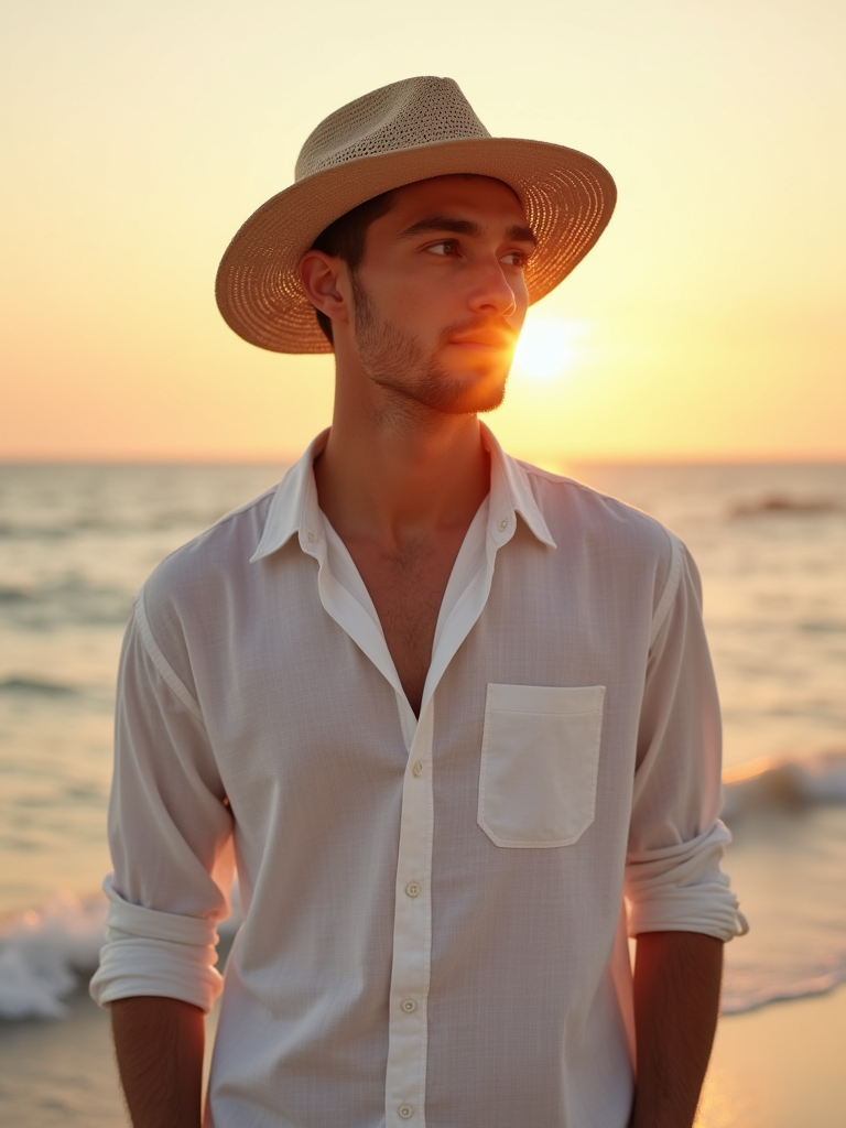 model at Scorpios beach club, wearing relaxed white linen outfit with woven hat, sunset over the sea