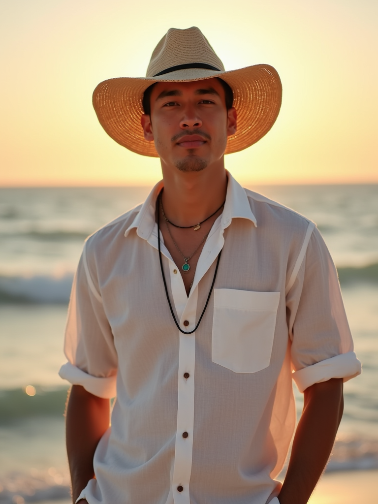 model at Scorpios beach club, wearing relaxed white linen outfit with woven hat, sunset over the sea