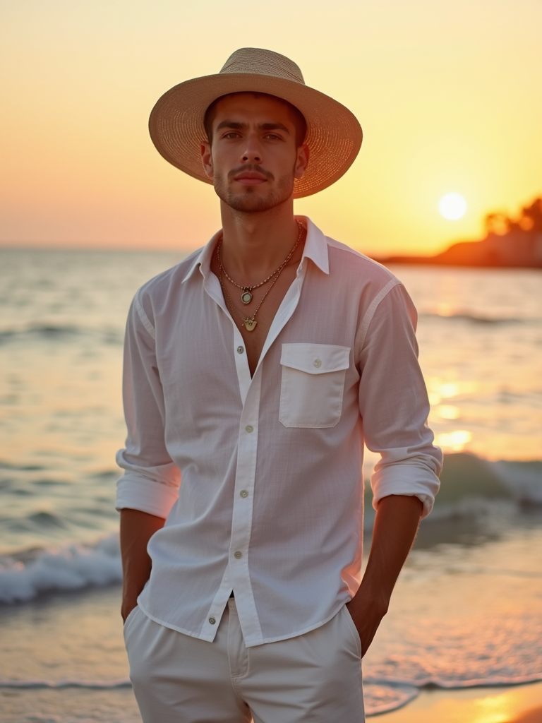model at Scorpios beach club, wearing relaxed white linen outfit with woven hat, sunset over the sea