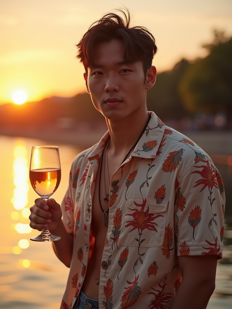 model at Seine River during sunset, wearing a summer festival outfit, holding a glass of wine