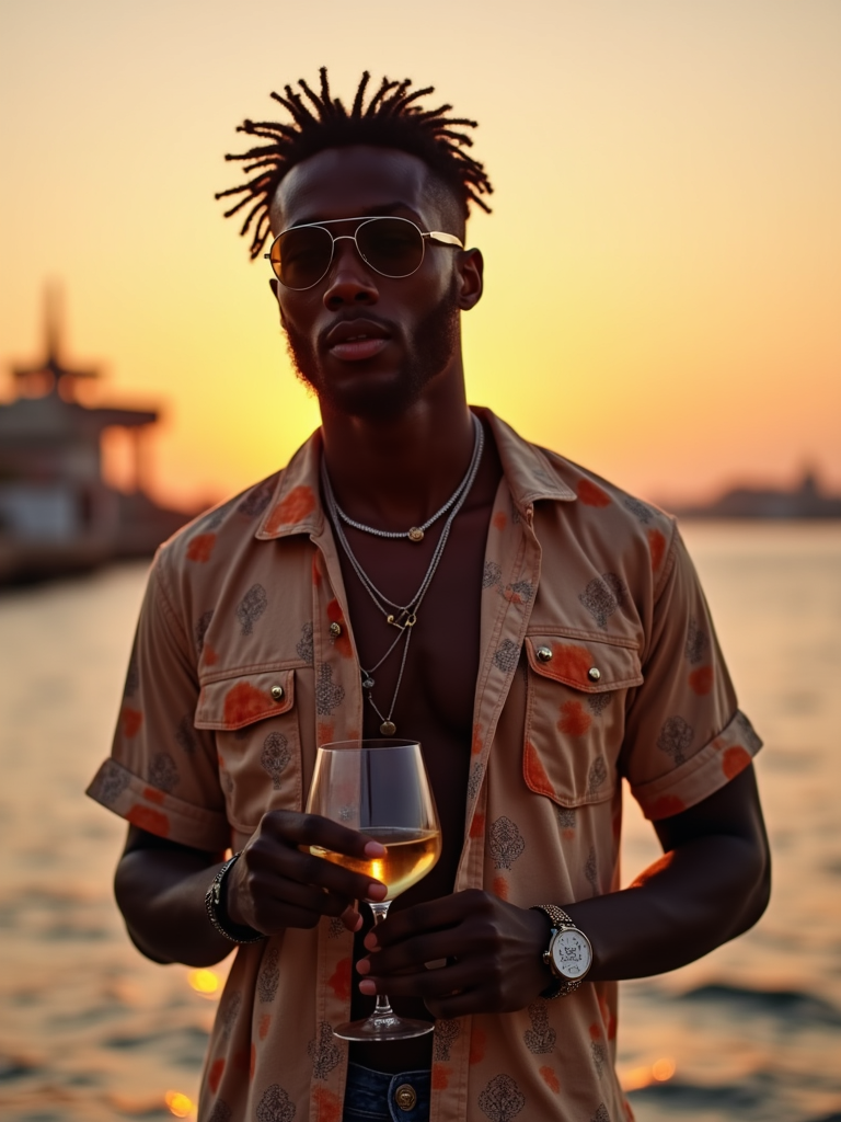 model at Seine River during sunset, wearing a summer festival outfit, holding a glass of wine