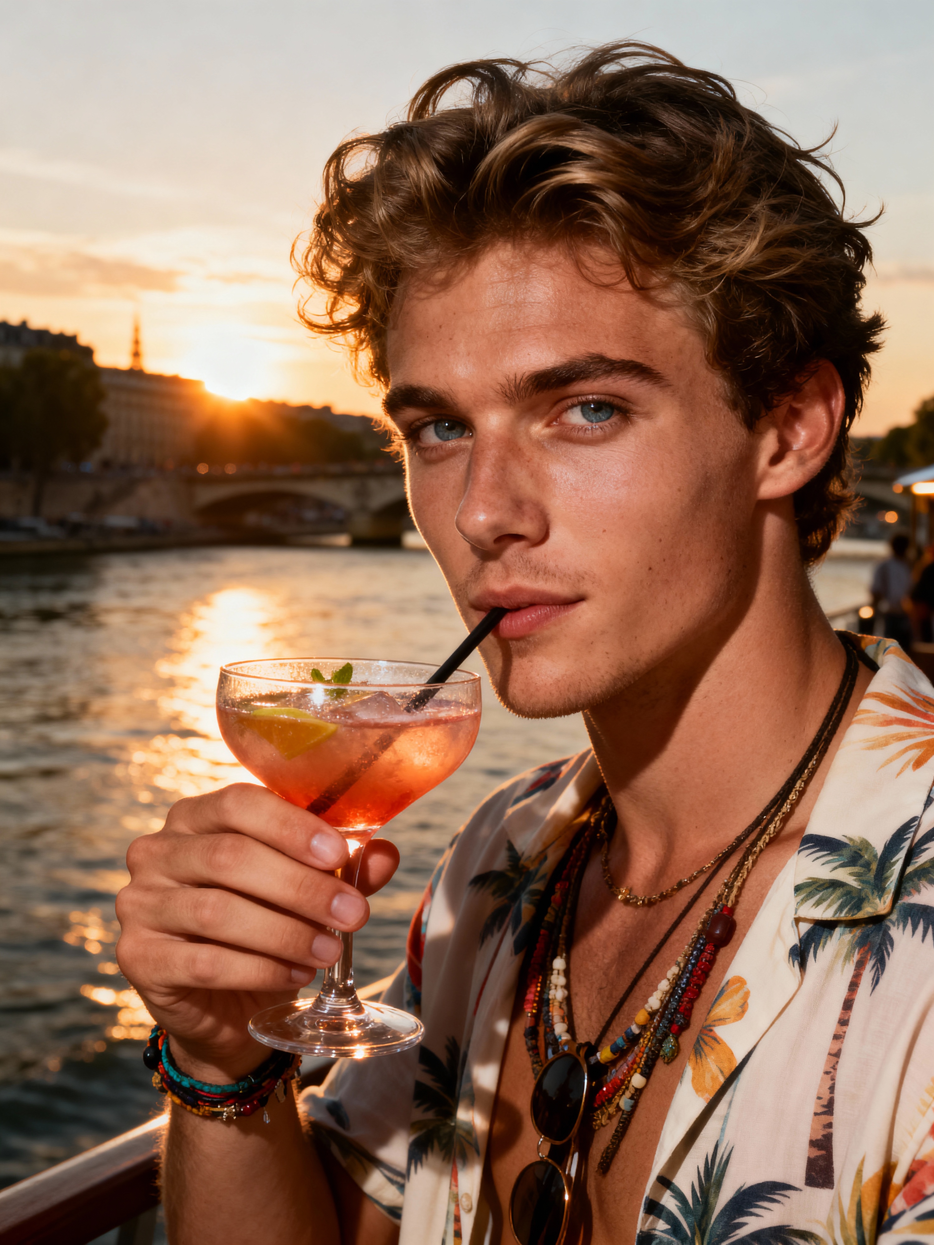 model at Seine River during sunset, wearing a summer festival outfit, holding a glass mocktail