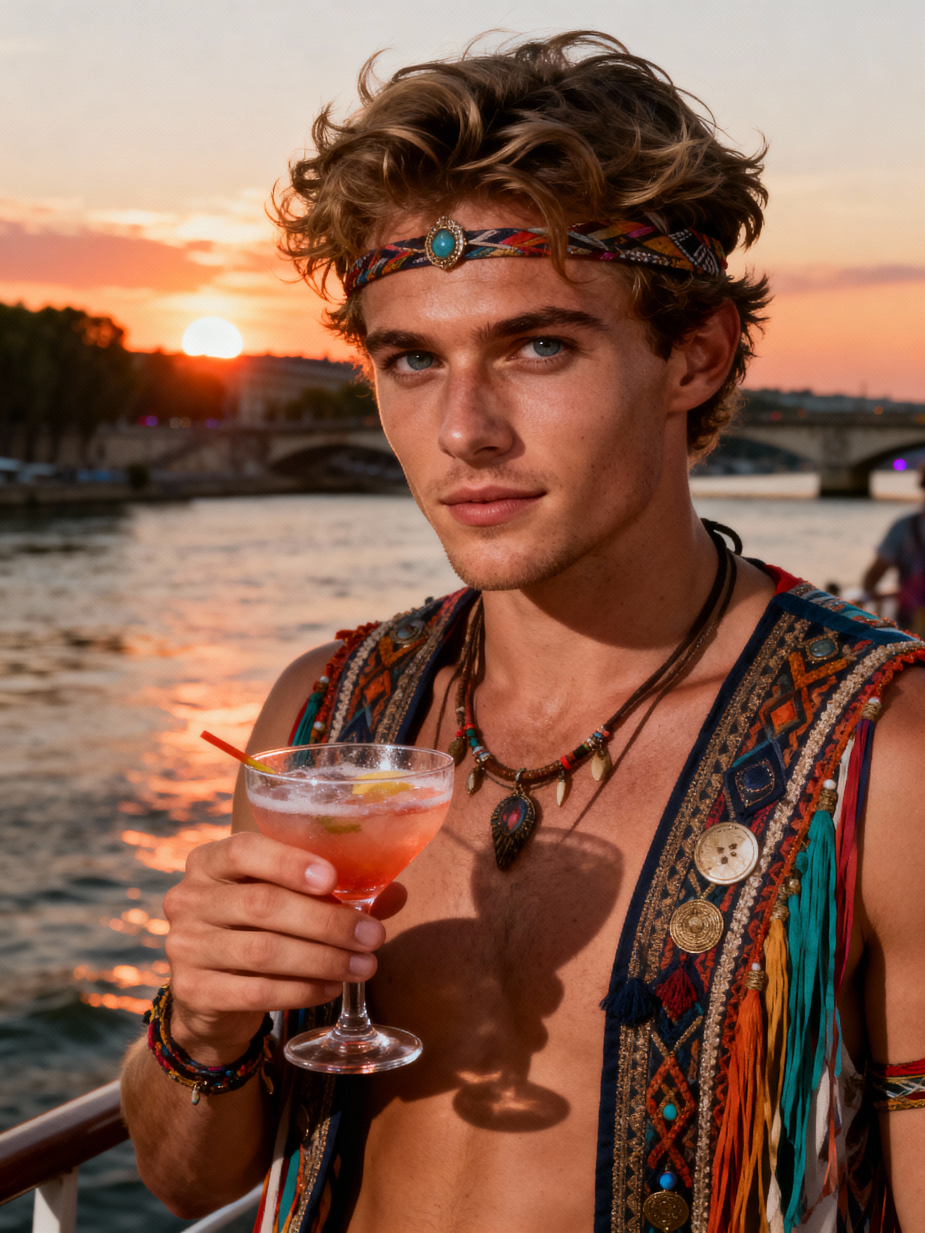 model at Seine River during sunset, wearing a summer festival outfit, holding a glass mocktail