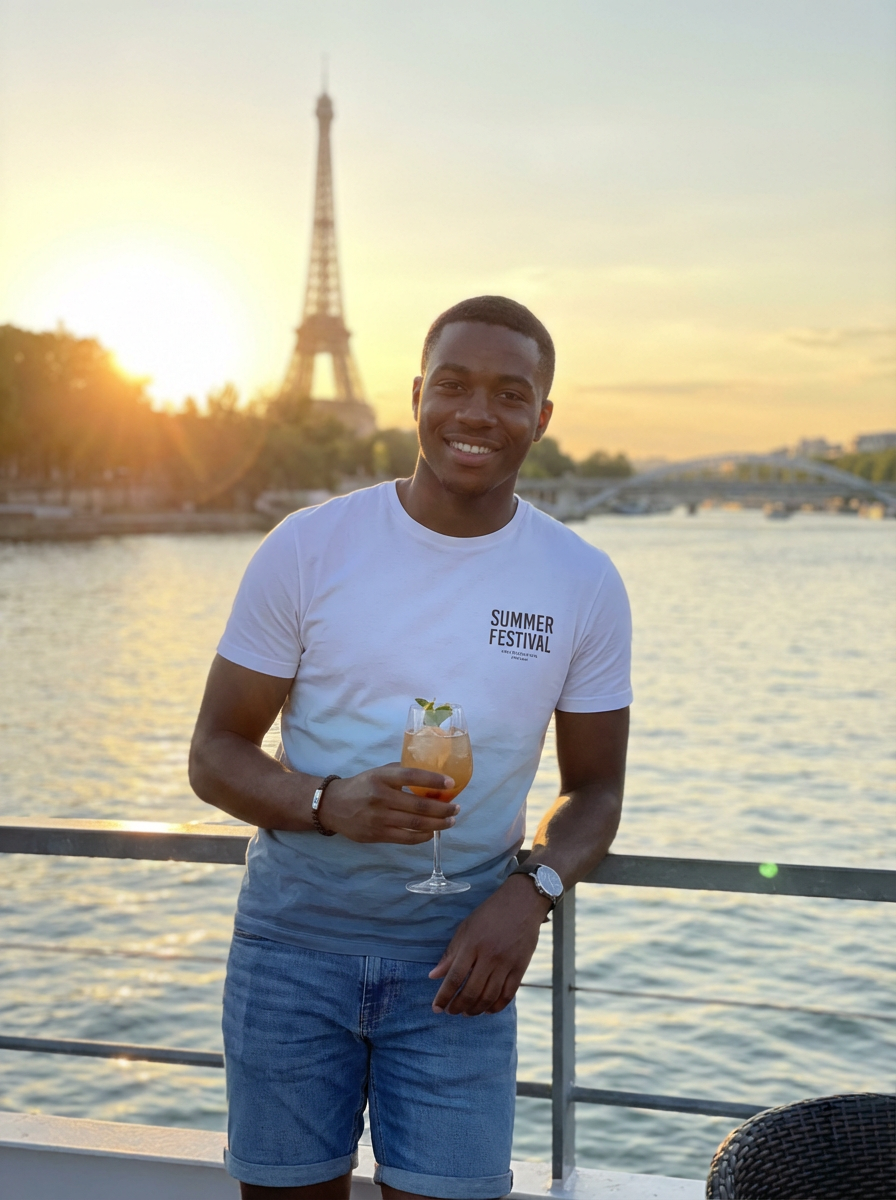 model at Seine River during sunset, wearing a summer festival outfit, holding a glass mocktail