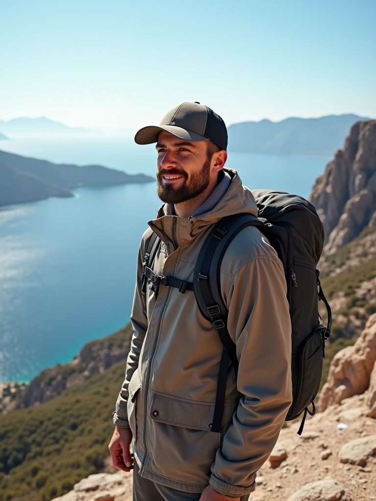 model at Skaros Rock viewpoint, wearing comfortable hiking clothes with cap, breathtaking 360-degree island views