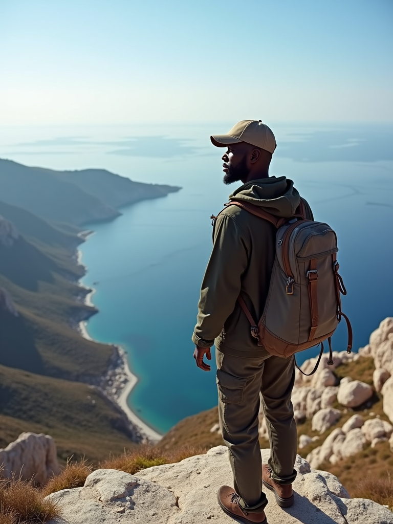 model at Skaros Rock viewpoint, wearing comfortable hiking clothes with cap, breathtaking 360-degree island views