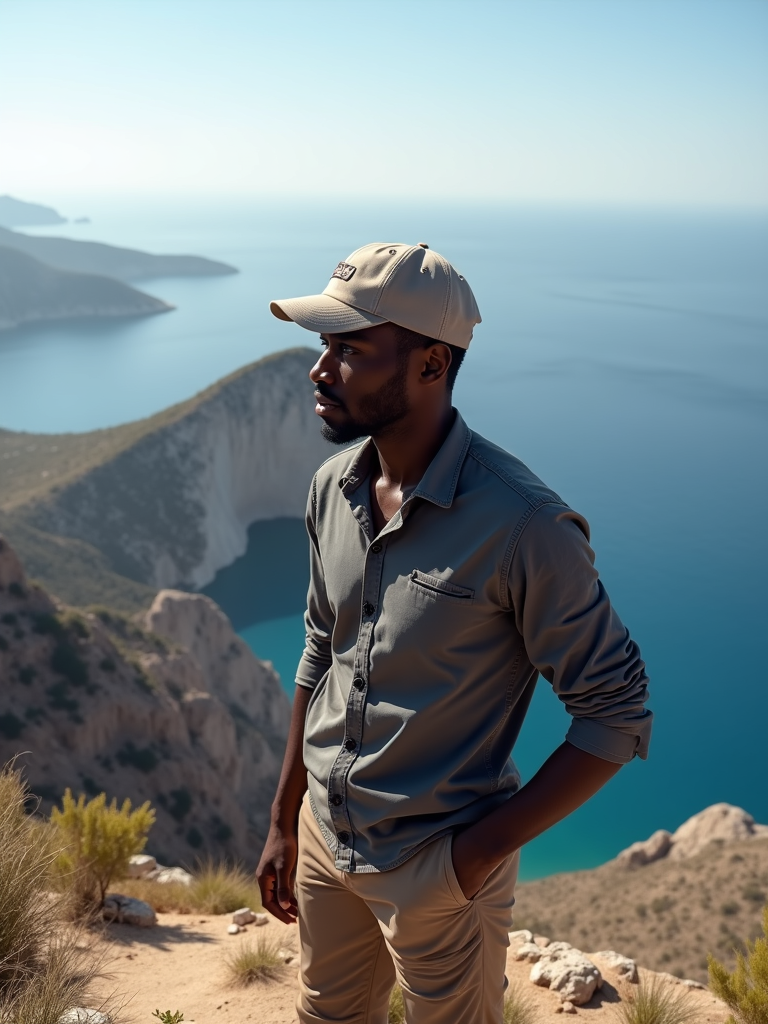 model at Skaros Rock viewpoint, wearing comfortable hiking clothes with cap, breathtaking 360-degree island views