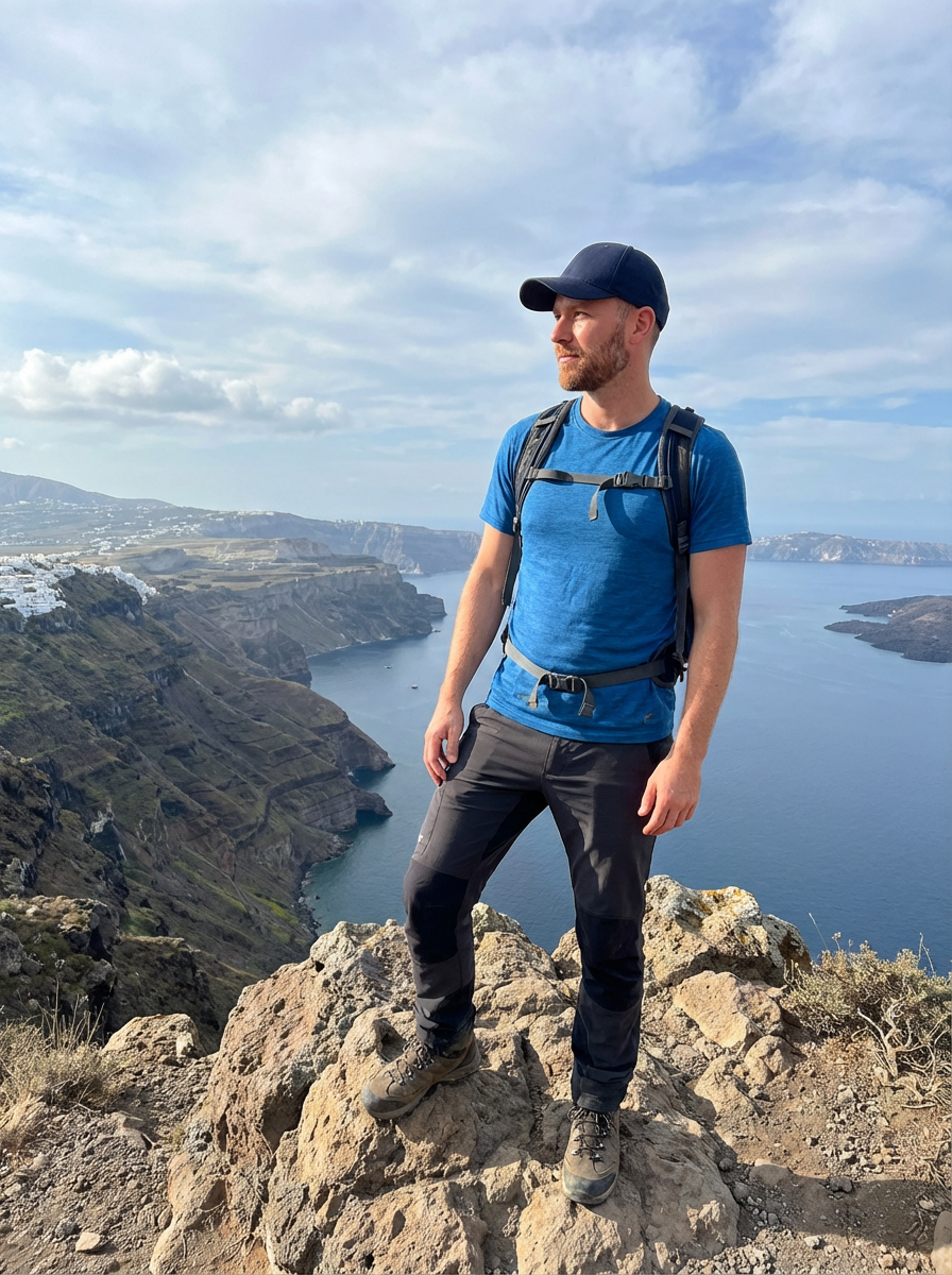 model at Skaros Rock viewpoint, wearing comfortable hiking clothes with cap, breathtaking 360-degree island views
