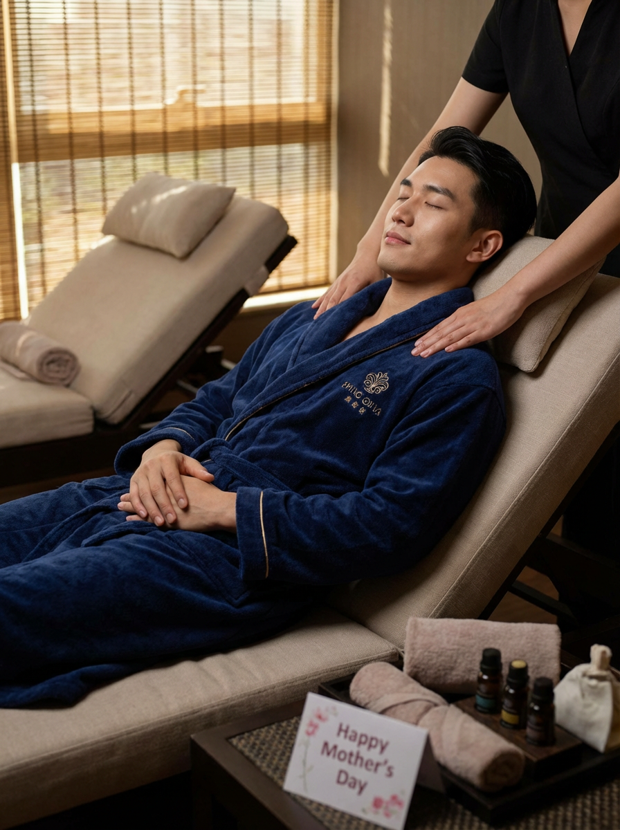model at spa day, Mothers Day pampering, luxurious robe, relaxation treatment, serene expression