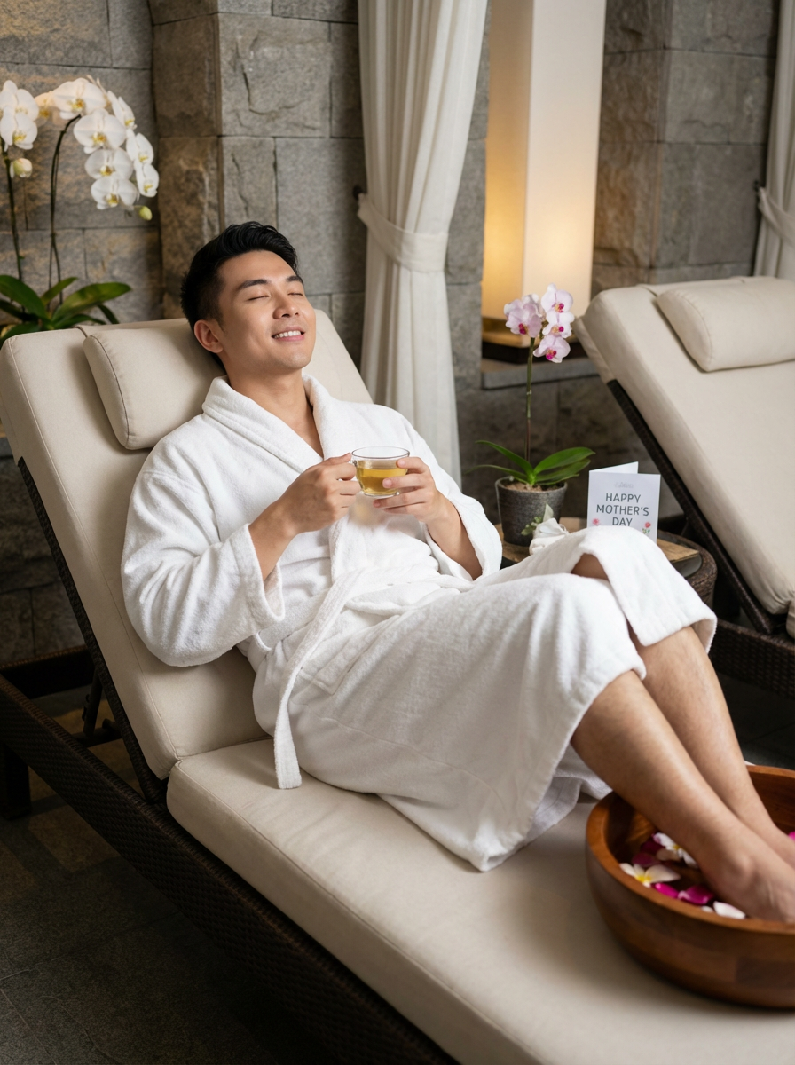 model at spa day, Mothers Day pampering, luxurious robe, relaxation treatment, serene expression