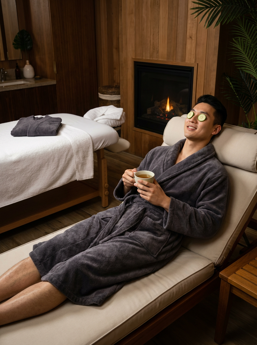 model at spa day, Mothers Day pampering, luxurious robe, relaxation treatment, serene expression
