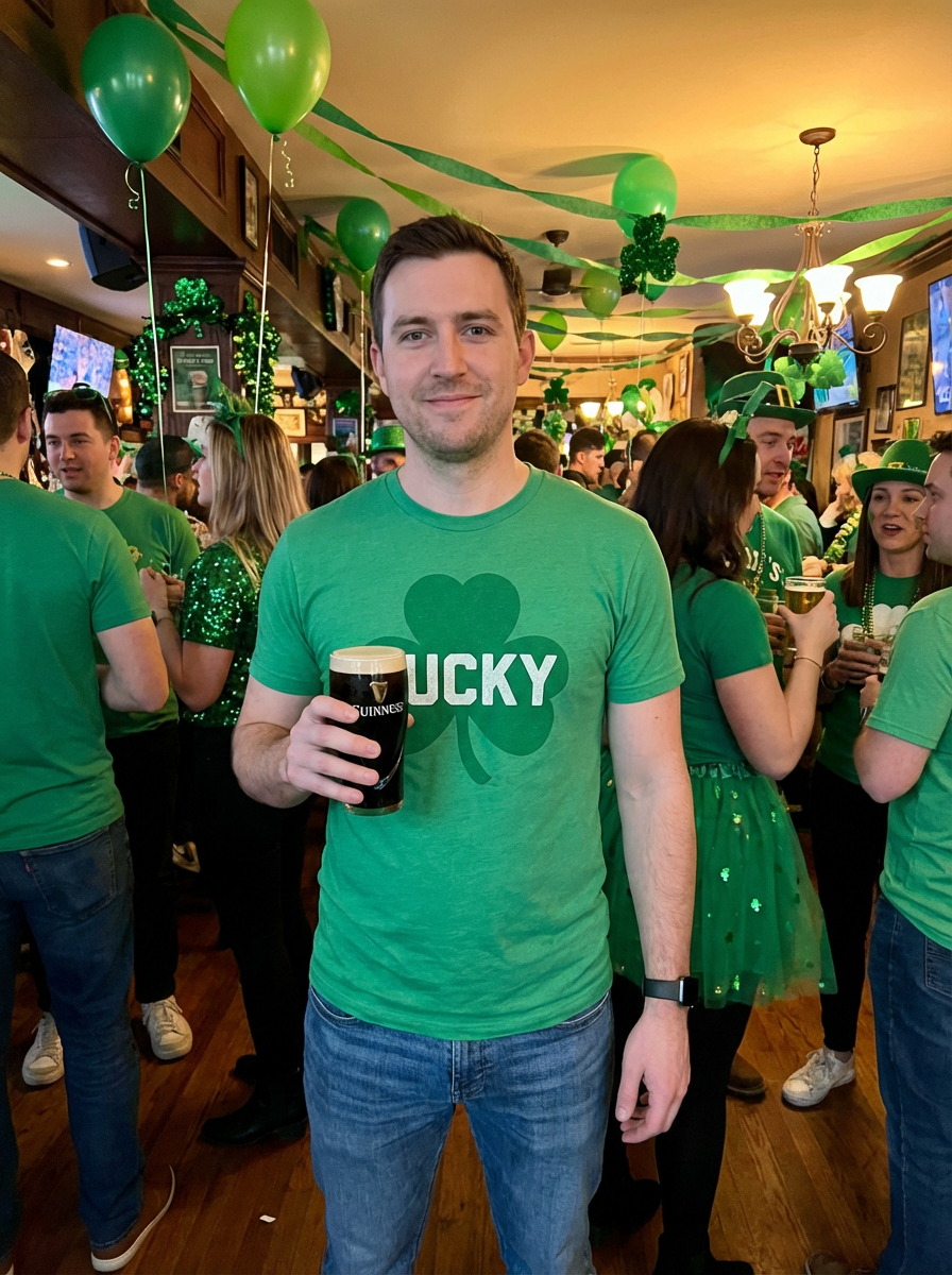 model at St Patricks Day party, green decorations, group celebration vibe, festive attire
