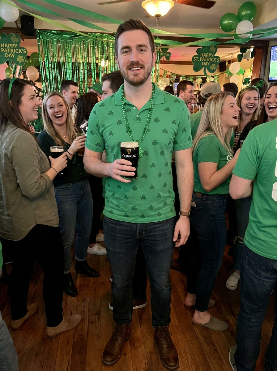 model at St Patricks Day party, green decorations, group celebration vibe, festive attire