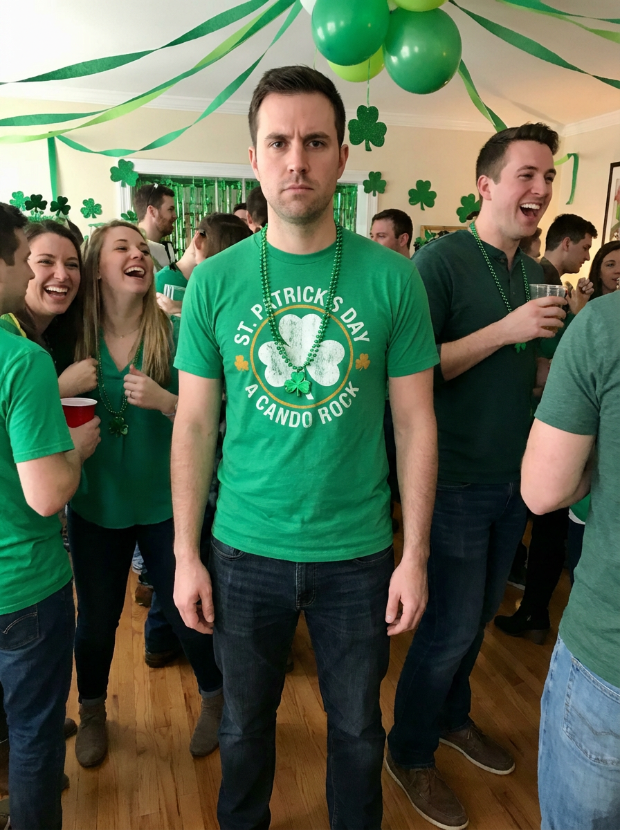 model at St Patricks Day party, green decorations, group celebration vibe, festive attire