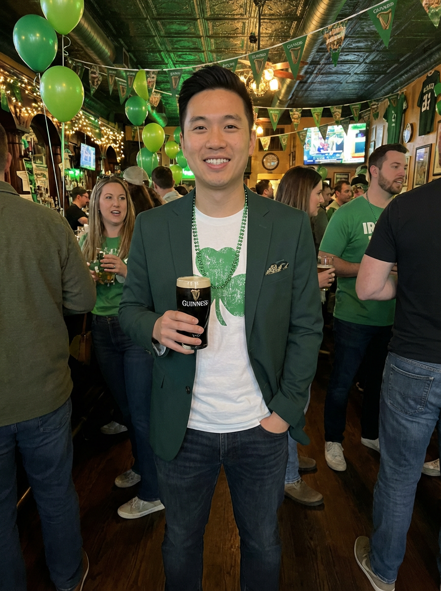 model at St Patricks Day party, green decorations, group celebration vibe, festive attire