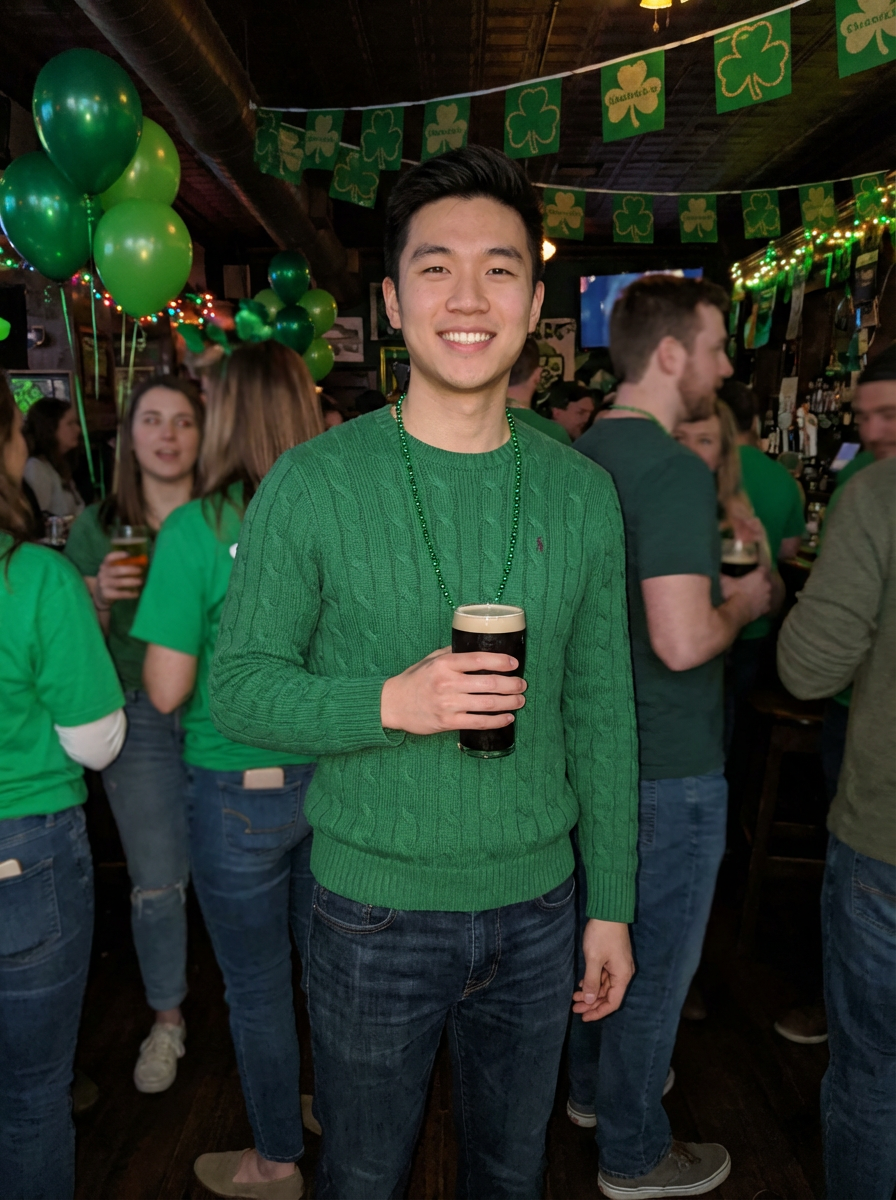 model at St Patricks Day party, green decorations, group celebration vibe, festive attire