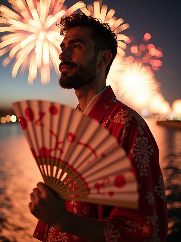 model at Sumida River during fireworks festival, wearing a summer festival jinbei, holding a paper fan