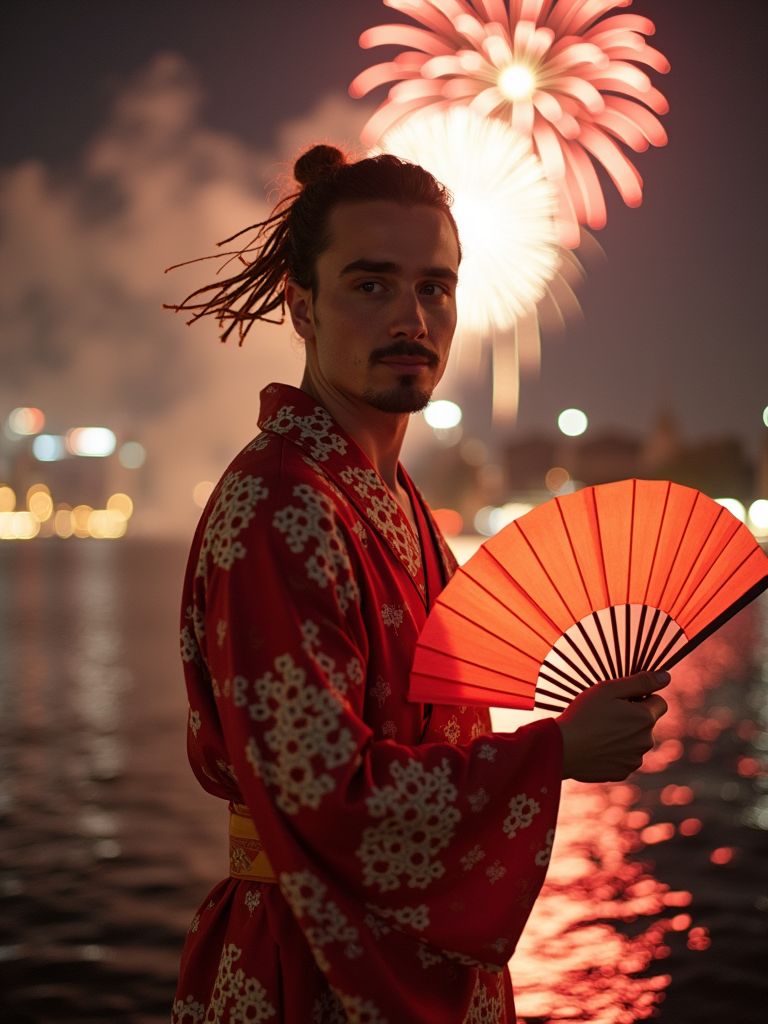 model at Sumida River during fireworks festival, wearing a summer festival jinbei, holding a paper fan