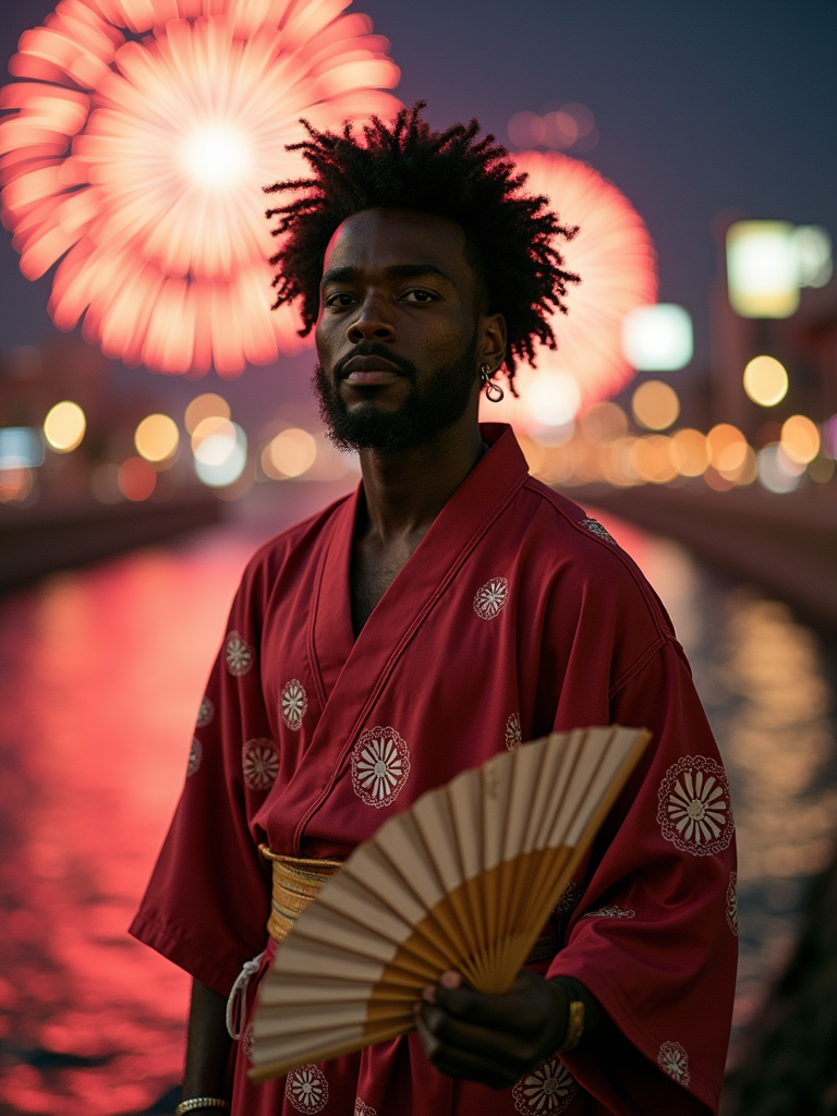 model at Sumida River during fireworks festival, wearing a summer festival jinbei, holding a paper fan