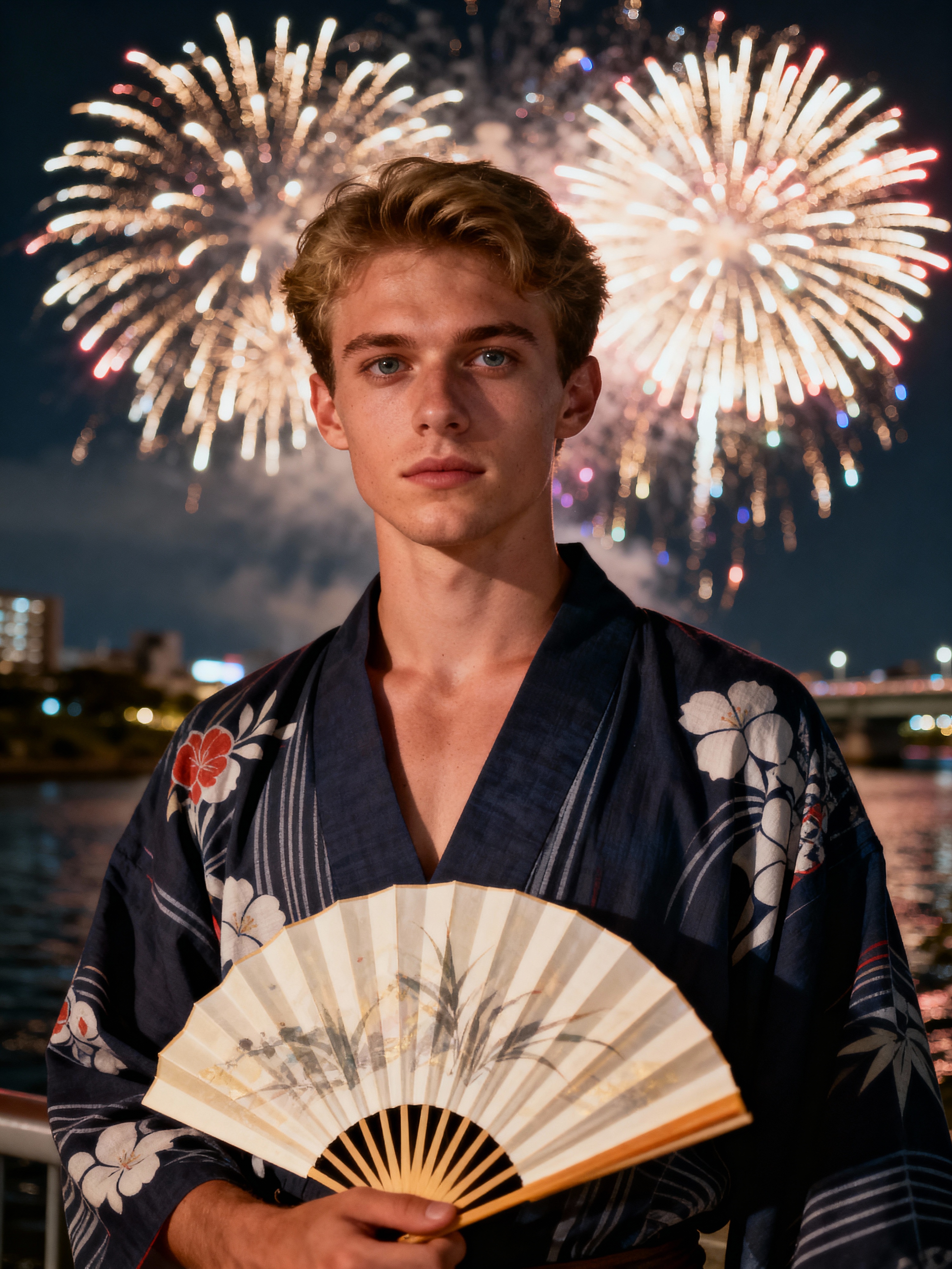 model at Sumida River during fireworks festival, wearing a summer festival jinbei, holding a paper fan