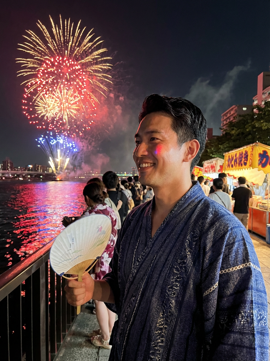 model at Sumida River during fireworks festival, wearing a summer festival jinbei, holding a paper fan