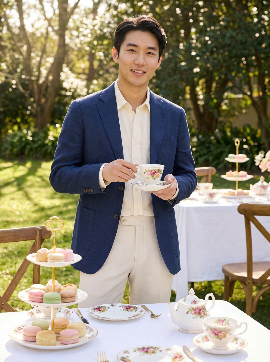 model at tea party setting, elegant china, spring treats, sophisticated casual outfit