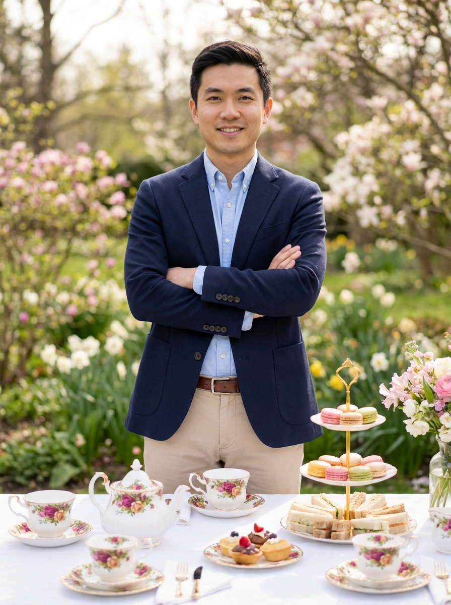 model at tea party setting, elegant china, spring treats, sophisticated casual outfit